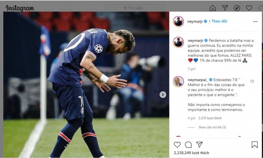 Siêu sao người Brazil viết: “Chúng ta thua trận đánh nhưng cuộc chiến vẫn tiếp diễn. Tôi tin vào đội bóng của mình, tôi tin rằng chúng ta có thể chơi tốt hơn hôm nay. Tiến lên Paris, 1% may mắn, 99% niềm tin quyết định chiến thắng”.